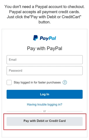 If you don't have a PayPal account, we accept all credit cards: just select 'PayPal' and click the 'Pay with Debit or Credit Card' button.