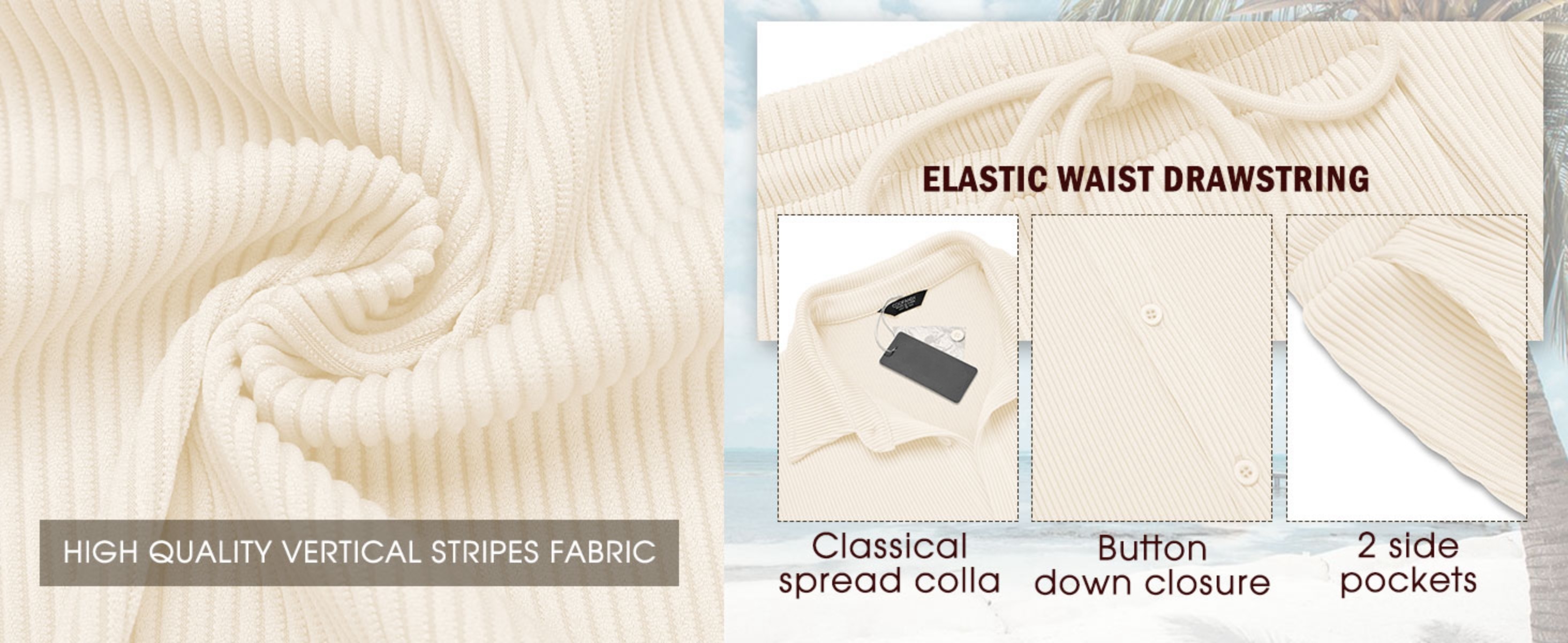 - Classic Casual Set -- Button down shirt, short sleeve, spread collar; loose fit long pants with 2 side pockets, one back pocket, elastic waist drawstring.A simple and classic combination of a shirt and long trousers set that saves you time choosing a pairing.
