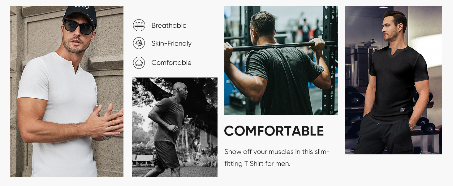 - Multiple occasions: This short sleeve muscle T shirt Running,joggers,power walking,cycling,hiking,gym training. Pair them with chinos or jeans for casual daily wear. These versatile longline T-shirts are essential basic garments that every man should have in their wardrobe. Suitable for all seasons, these T-shirts can be worn to the office, on a date, to the club, to the beach, or simply for casual daily wear.