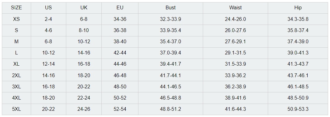 | SIZE | US | UK | EU | Bust | Waist | Hip |